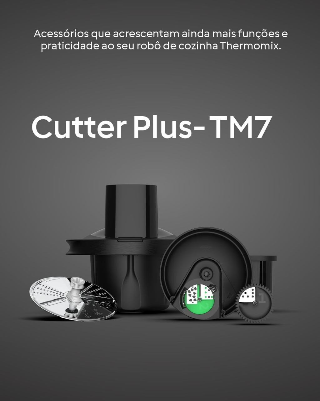 O Cutter Plus é o acessório da Thermomix criado para realizar seis tipos de corte: fatiar fino, fatiar grosso, ralar fino, ralar grosso, espiralizar fino e espiralizar grosso. Você prepara legumes, frutas e vegetais com precisão e rapidez, direto na sua Thermomix.